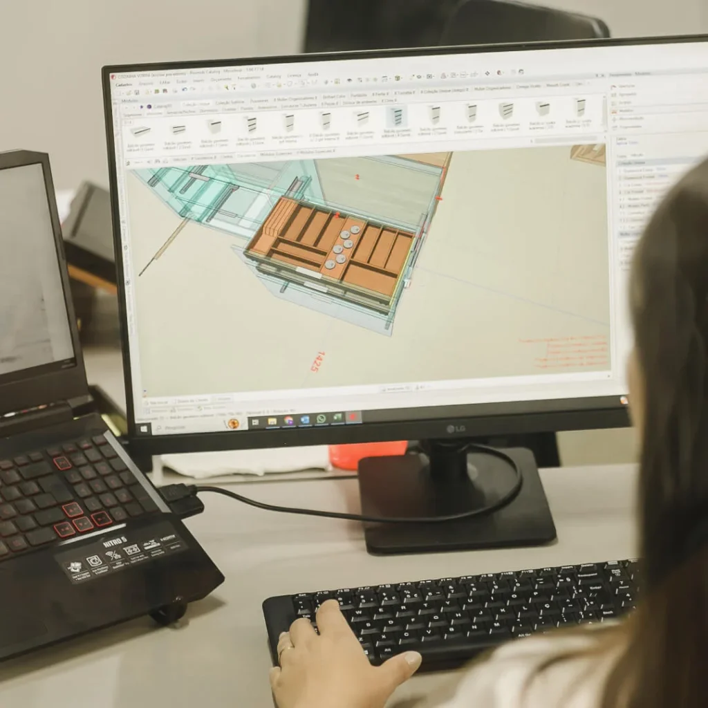 Oferecemos um diferencial aos nossos parceiros, temos nossa biblioteca completa de produtos dentro do Promob, com todos os acabamentos disponíveis. Isso facilita o trabalho de projetistas e arquitetos, permitindo a inclusão direta dos organizadores nos projetos, inclusive dentro das gavetas. Essa integração torna o processo de apresentação e venda ao cliente muito eficiente e atrativa.